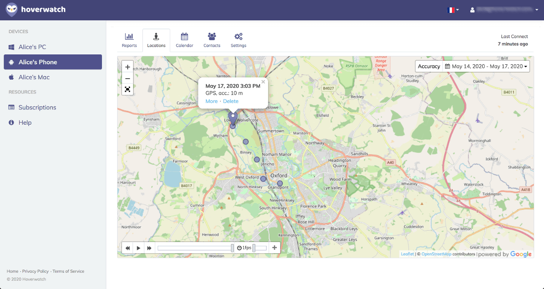 Hoverwatch vous permet de localiser un téléphone portable en direct ou de suivre son parcours sur la période de votre choix.