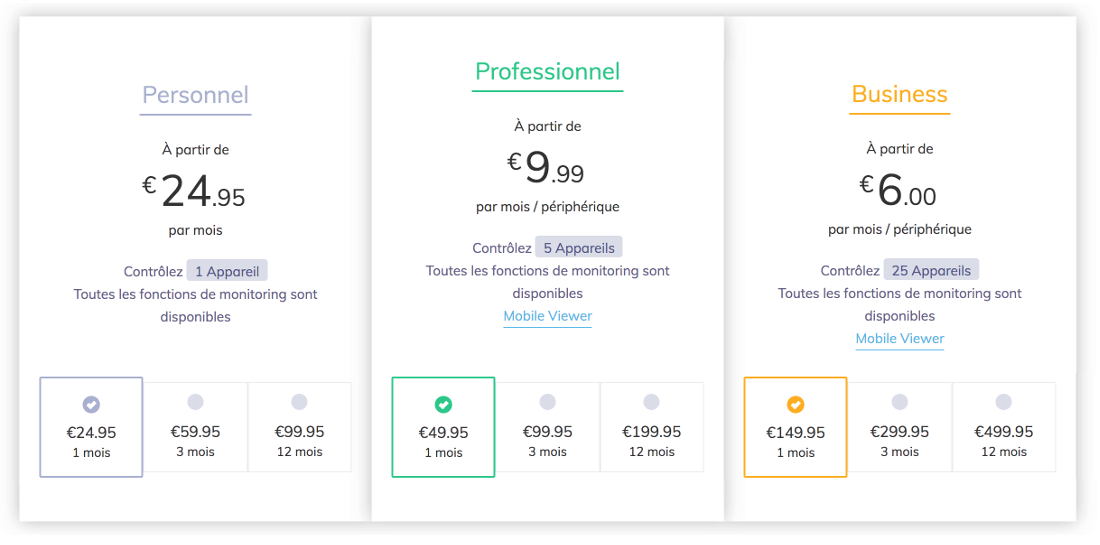 Les variations de prix sont simplement liées à la durée et au nombre de téléphone que vous souhaitez espionner. Evidemment plus vous souhaitez espionner un nombre important de téléphone plus le prix augmente. A l'inverse, plus vous choisissez une durée longue, plus le prix baisse.